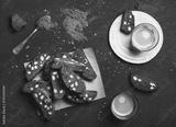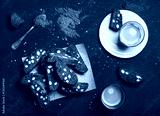 Dark chocolate and sea salt Biscotti with almonds and two glasses of coffee espresso over dark stone background, top view, selective focus, horizontal composition