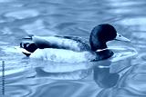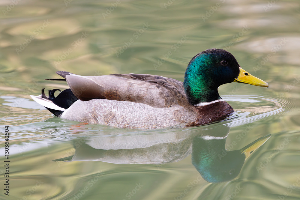 Male drake, a mallard duck portrait with curled tail feathers visible, at Agua Caliente Park in Tucson, Arizona, USA