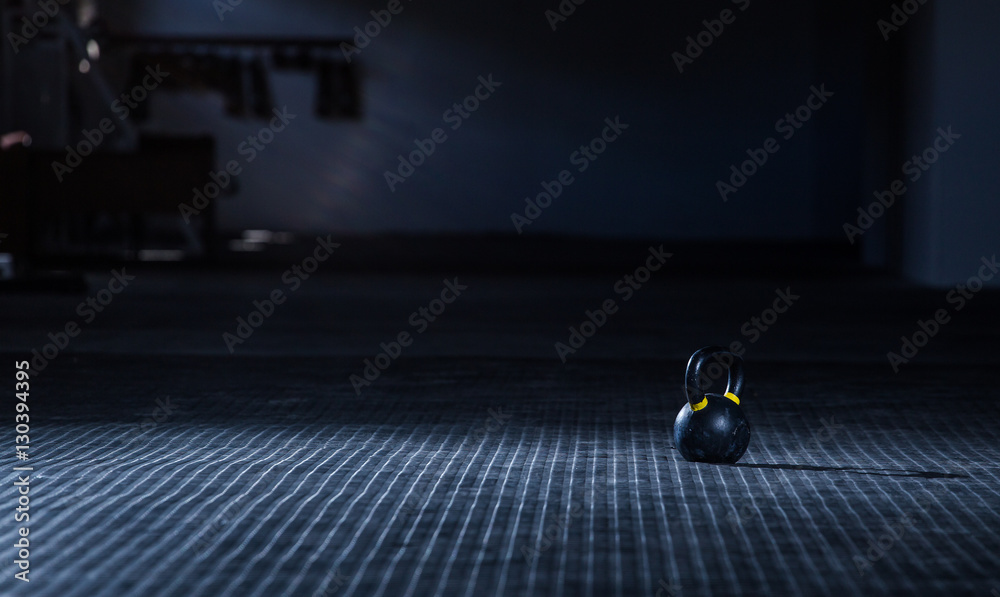 Kettle bell weight in a dark gym with moody and edgy lighting