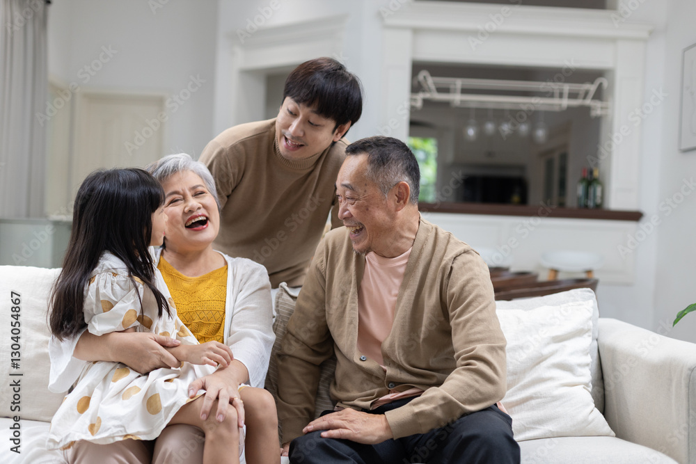Grandmother, grandfather, and two younger family members are sitting on a couch engaging in lively conversation and sharing smiles. The atmosphere is warm and inviting.