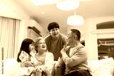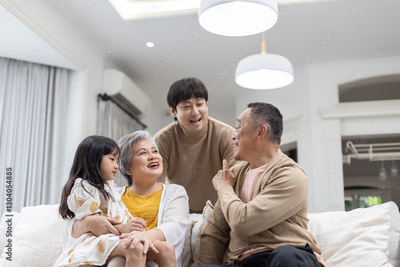Grandmother, grandfather, and two younger family members are sitting on a couch engaging in lively conversation and sharing smiles. The atmosphere is warm and inviting.
