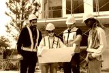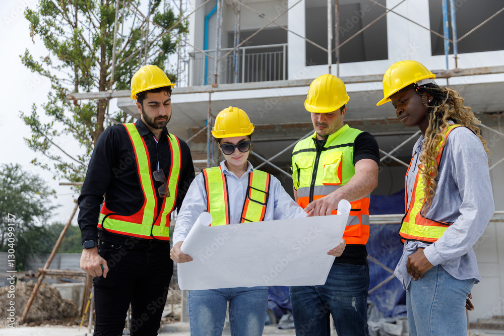 Person group of construction workers examines blueprints together at a construction site. They discuss plans with focus while wearing safety gear.