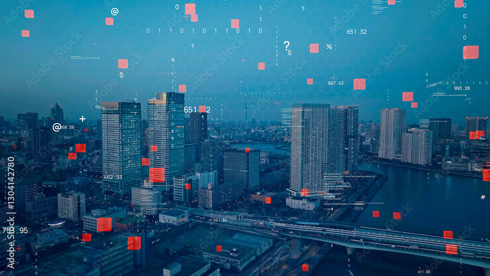 city, urban, road, landscape, technology, network, digital, transformation, DX, ICT, data, buildings, business, cyber, aerial view, bird eye view, drone, high-angle, perspective, panorama, society, mo