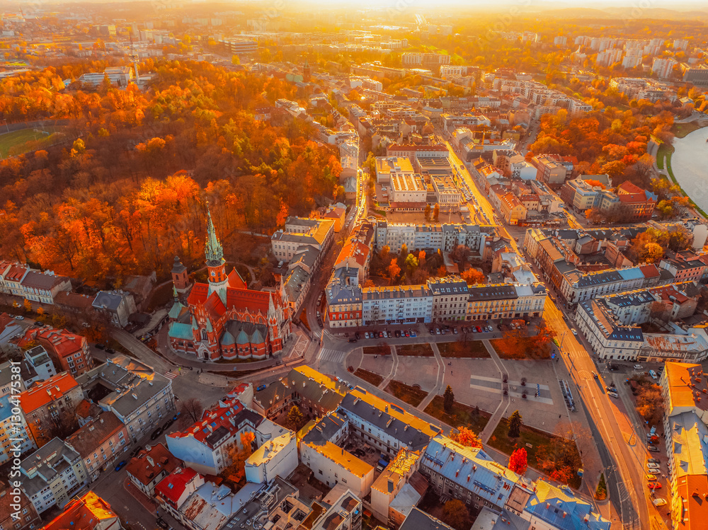 Church Saint Joseph at Podgorski Square in Podgorze district city view near river in Krakow Poland. Autumn landscape on coast river Wisla.