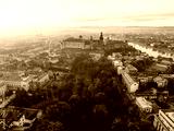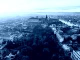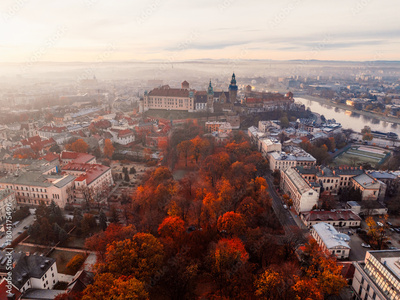 Wawel castle landmark with city view near river in Krakow Poland. Autumn landscape on coast river Wisla.