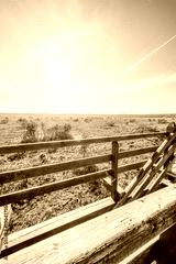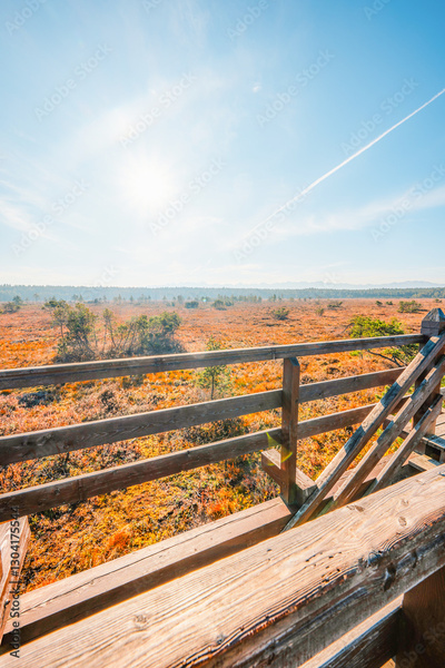 A wooden walking path Bor na Czerwonem nature reserve in Nowy Targ in Poland