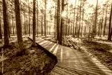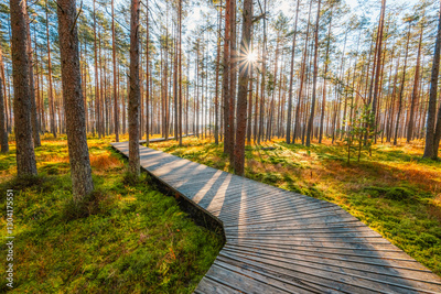 A wooden walking path Bor na Czerwonem nature reserve in Nowy Targ in Poland