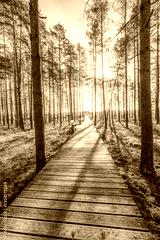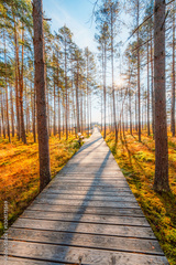 A wooden walking path Bor na Czerwonem nature reserve in Nowy Targ in Poland