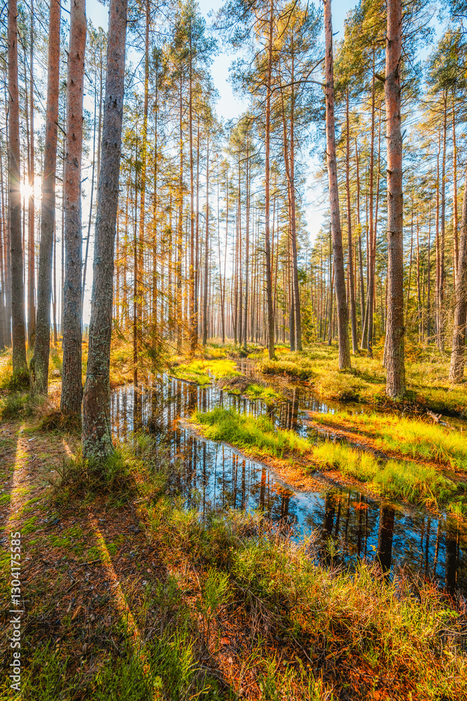 A wooden walking path Bor na Czerwonem nature reserve in Nowy Targ in Poland