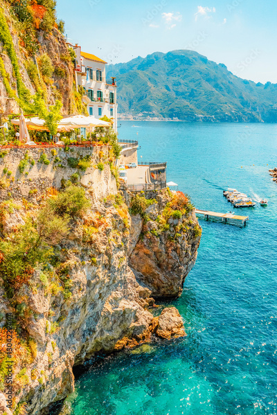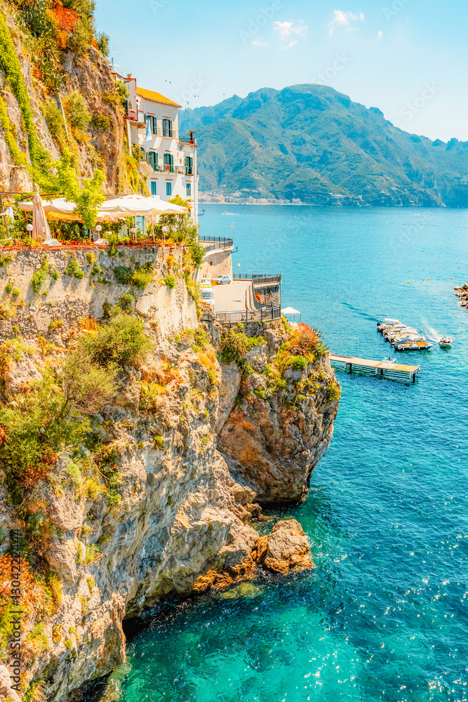 Atrani famous coastline in southern Italy, vertiginous cliffs adorned with colorful villages, turquoise waters. Small town Atrani on Amalfi Coast in province of Salerno, Campania region, Italy