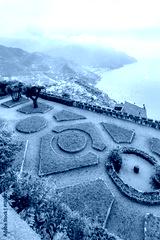 Coastline in southern Italy, vertiginous cliffs adorned with colorful villages, turquoise waters. Villa Rufolo in Ravello on Amalfi Coast in Italy.