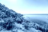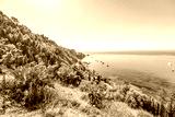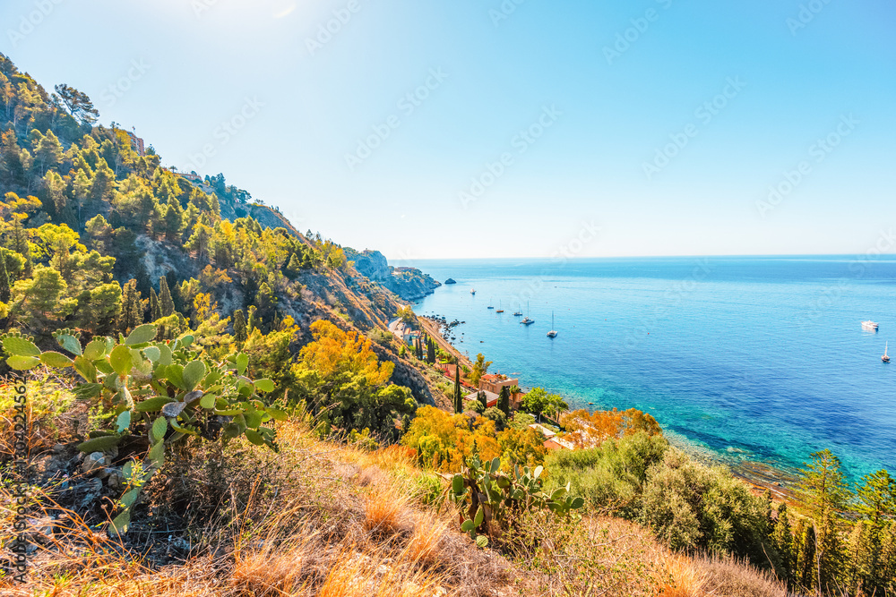 Cityscape of town of Taormina, Sicily with beautiful rock cliff and beach.