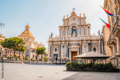 View of Cathedral Sant Agata on Piazza del Duomo with Elephant Fountain. in Catania, Sicily, Italy.