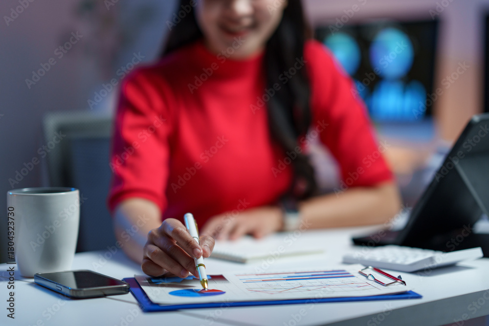 Asian businesswoman pointing at pie chart and bar graph on paperwork with pen, working with financial documents using tablet and calculator late at night in office