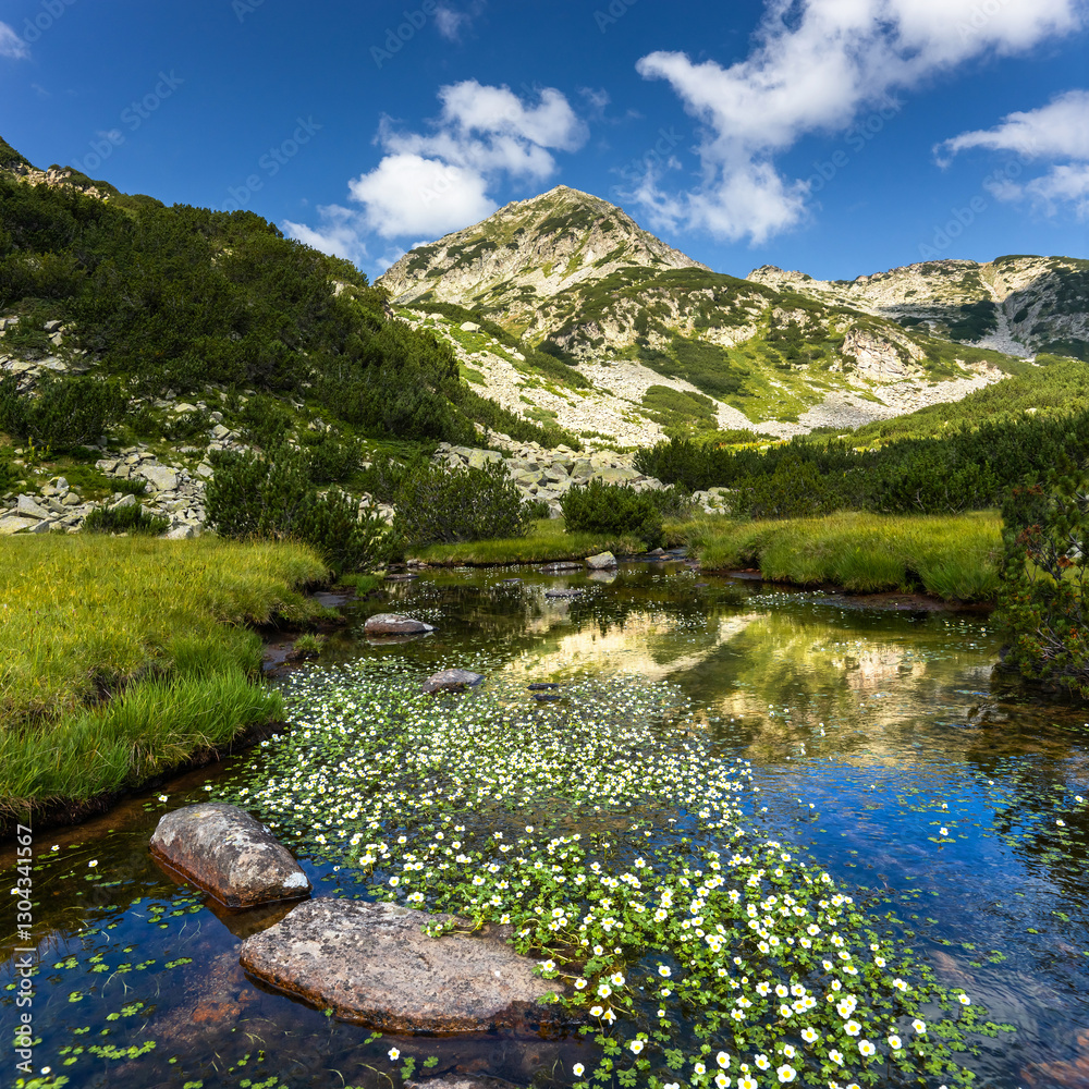 A small mountain river overgrown with white water flowers against rocky Muratov peak. Pirin national park, Bulgaria.