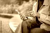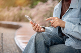 A person dressed in denim jacket and jean is pointing at the phone holding in right hand while sitting cross legged on bench.