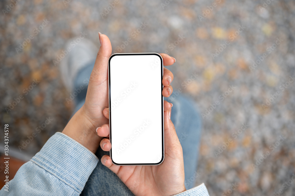 A close up shot of the pair of hand holding white screen smartphone while sitting cross legged.