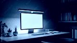 A white screen computer on wooden table beside bookshelf. Study or working at night under lamp light