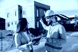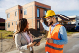 Engineer in protective uniform talking to a businesswoman with tablet and pointing at construction site in a blurry background.