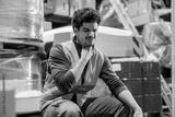 An ill interracial warehouseman with sore throat frowning.