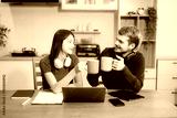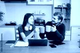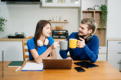 Modern couple collaborating over coffee in a cozy kitchen setting with a laptop, notebook, and breakfast