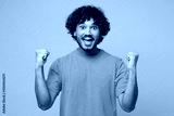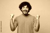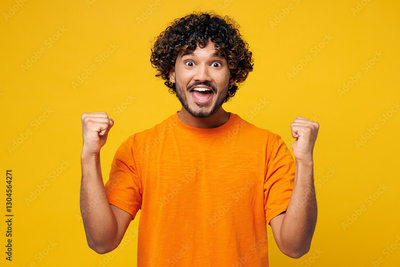 Young smiling fun happy Indian man he wear orange t-shirt casual clothes doing winner gesture celebrate clenching fists say yes isolated on plain yellow background studio portrait. Lifestyle concept.