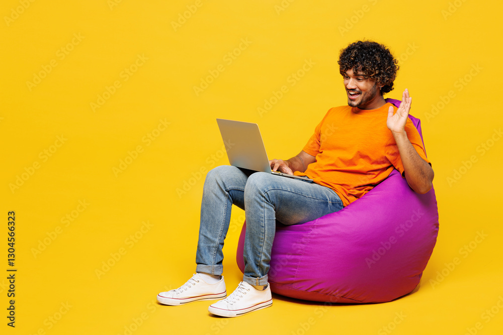 Full body young IT Indian man wear orange t-shirt casual clothes sit in bag chair hold use work on laptop pc computer waving hand isolated on plain yellow background studio portrait Lifestyle concept