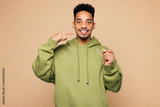 Young smiling happy man of African American ethnicity wears green hoodie casual clothes hold invisible transparent aligners, invisalign dental braces point on teeth isolated on plain beige background.