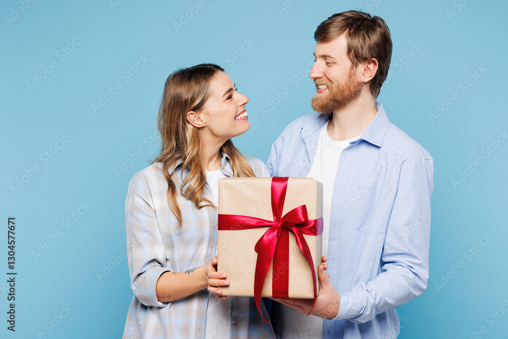 Young couple two friends family man woman wearing shirt casual clothes together hold present box with gift ribbon bow isolated on pastel plain light blue background studio portrait. Lifestyle concept.