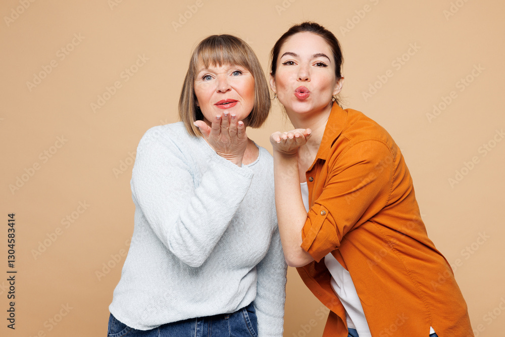 Elder happy parent mom 50s years old with young adult daughter two women together wear casual clothes blow send air kiss look camera isolated on plain pastel light beige background Family day concept