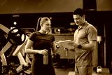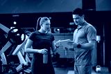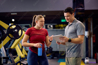 Young athlete and her fitness instructor analyzing exercise plan on touchpad in gym.