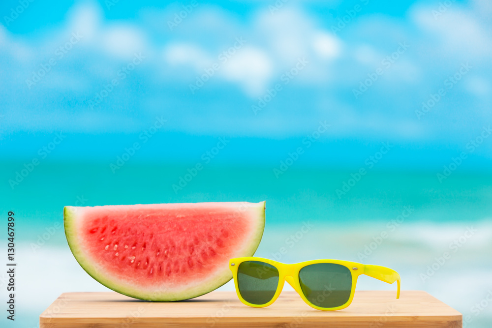 Happy summer holidays concept. Slice of watermelon and sunglasses against a beach background.