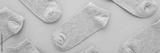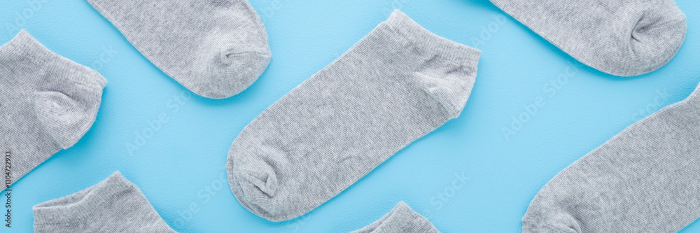 Many new light gray short socks on blue table background. Pastel color. Closeup. Clothes pattern. Wide banner. Top down view.
