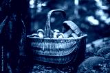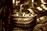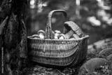 Wicker basket filled with freshly harvested porcini mushrooms near a mossy pine tree in the autumn forest. Boletus edulis foraging