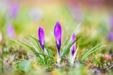Unopened vibrant crocus flowers with drops of dew early in the morning growing on spring meadow. Nature background