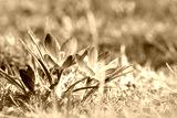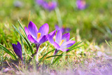 Macro shot of two crocus flowers on a green lawn, with a glowing sunlit grass in the distance. Close up nature photography
