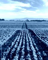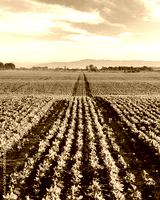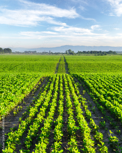 Endless rows of young corn plants forming natural waves in large farmland. Agricultural scenery