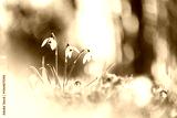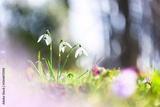 Delicate snowdrop flowers on spring meadow near forest closeup. Macro nature photography