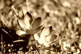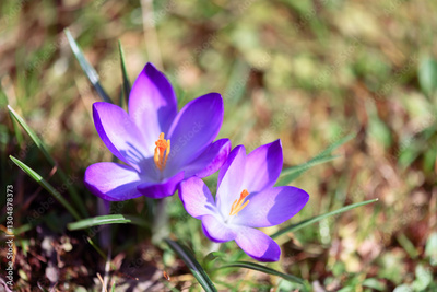 Close up of two vibrant crocus flowers blooming on spring meadow. Nature photography