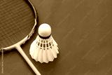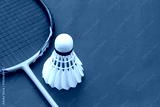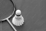 Badminton sport equipments, racket and white cream shuttlecock feather ball on red floor, soft and selective focus.