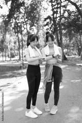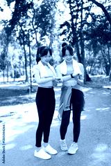Two young Asian women checking a smartwatch while taking a break from exercising in a park with trees and sunlight
