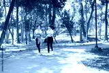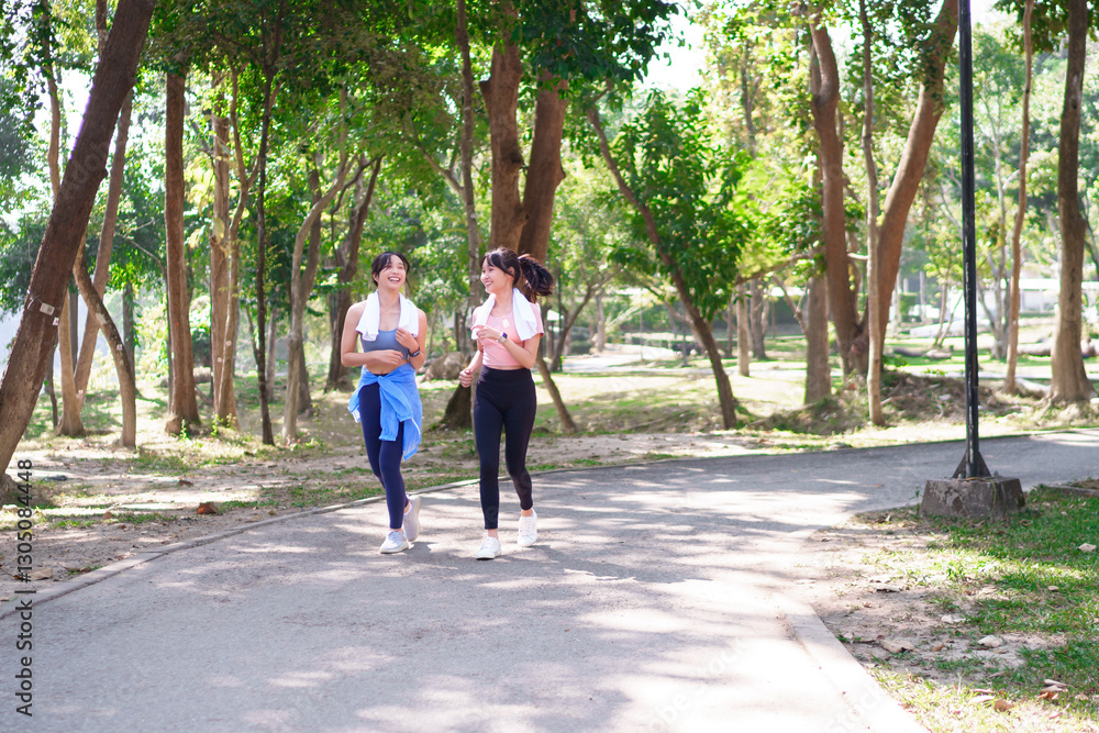Two young Asian women jogging together in a green park, enjoying outdoor exercise and a healthy lifestyle