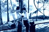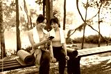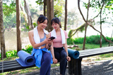 Two young Asian women sitting on a park bench, looking at a smartphone and resting after an outdoor workout