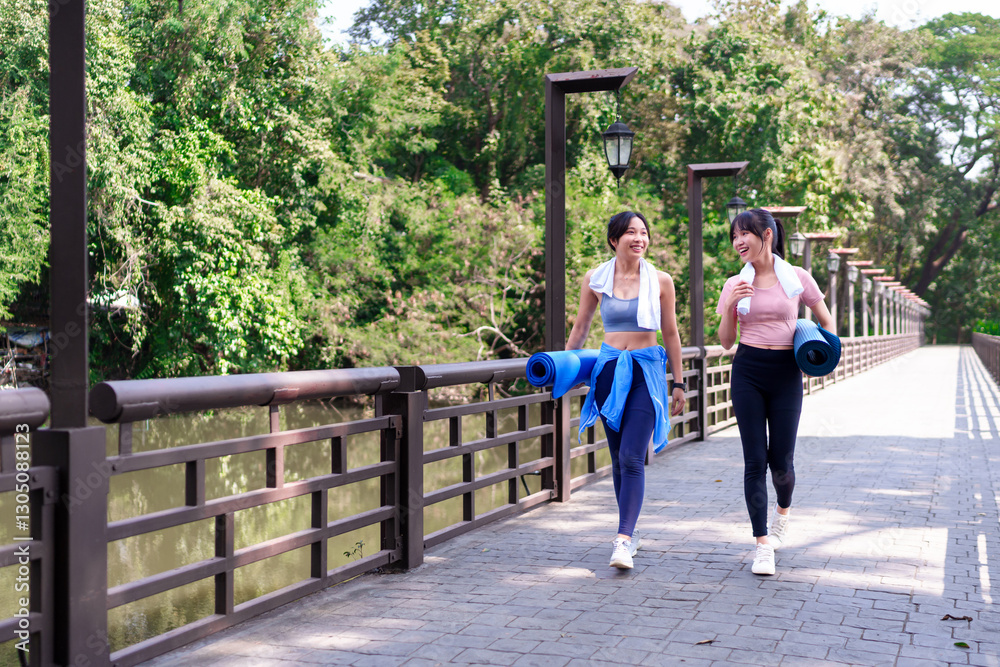 Two young Asian women walking on a wooden bridge in a park, cooling down after an outdoor workout