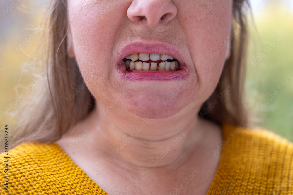Furious woman staring aggressively, Middle-aged woman making disgusted face outdoors, Facial expression of discomfort, surprise, or awkward social situation, negative social situation