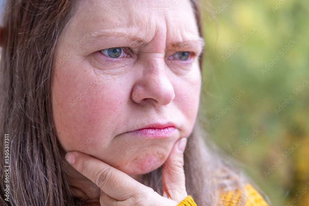 Furious woman staring aggressively, Middle-aged woman making disgusted face outdoors, Facial expression of discomfort, surprise, or awkward social situation, negative social situation