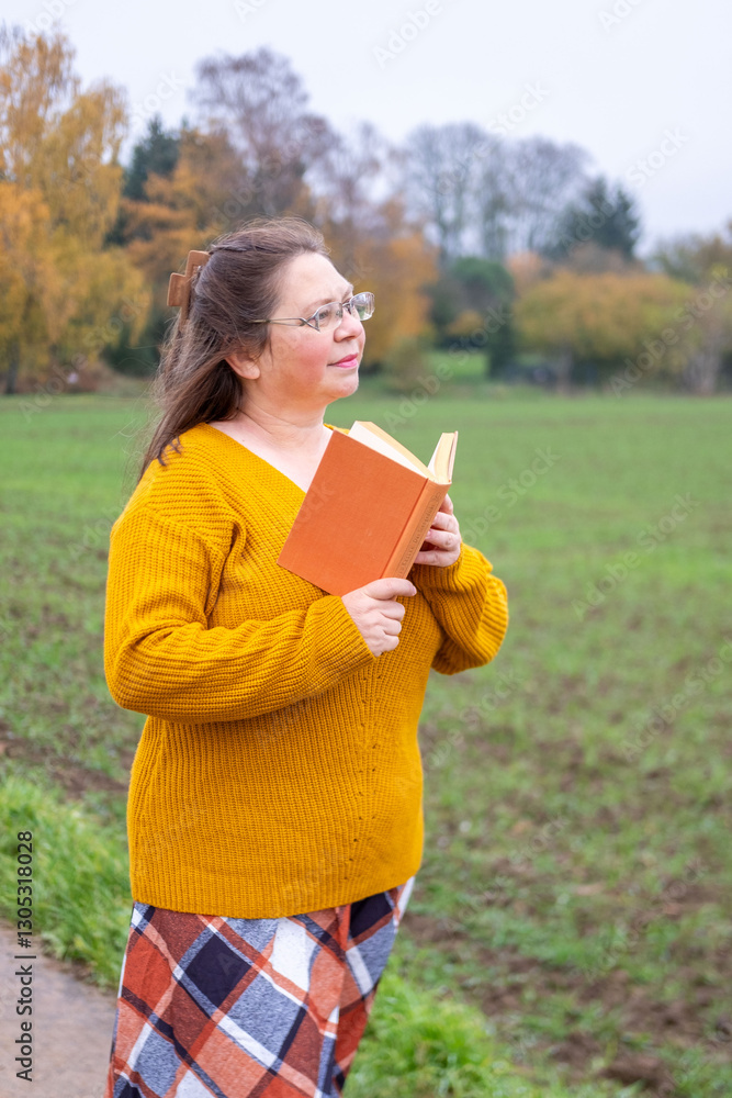woman with long dark hair holding book, Reader lost in thought, Literary reflection moment, portrait with golden fall foliage background