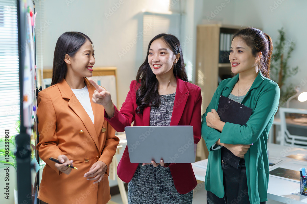 Asian businesswomen collaborating, planning strategy in contemporary workspace, analyzing data on laptop near whiteboard during professional meeting