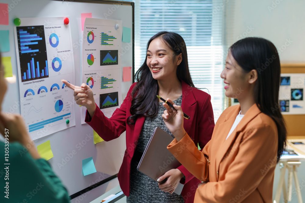 Asian businesswomen discussing marketing strategy, pointing at whiteboard charts, collaborating intensely during professional meeting in contemporary workspace