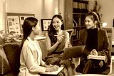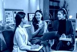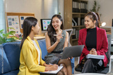 Three asian businesswomen are smiling and discussing strategy during a meeting in a modern office, using a laptop and taking notes on documents